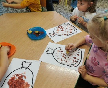 Były również zabawy edukacyjne oraz gra terenowa ,,Mali ziemniaczani detektywi”. Dużą atrakcją były stempelki z ziemniaka. Nie mogło zabraknąć degustacji ziemniaków. Przedszkolaki zajadały się gotowanymi ziemniakami z masełkiem. Wspólna zabawa Motylków i Pszczółek dała im wiele radości i była okazją do rozwijania zdolności poznawczych, kreatywności i współpracy.