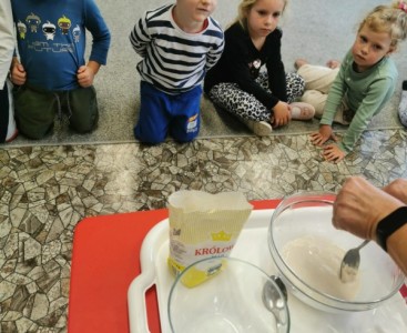 Przedszkolaki dowiedziały się jak powstaje chleb od ziarenka do bochenka, poznały różne rodzaje pieczywa, degustowały rogaliki, chleby i bułki żytnie i pszenne, obejrzały z jakich składników i jak wyrabia się ciasto na pieczywo. Przygotowana przez naszego gościa prezentacja była bardzo ciekawa i mogliśmy z niej wiele się dowiedzieć o pracy w piekarni. Przedszkolaki ulepiły również bułki i rogaliki z masy solnej, samodzielnie zagniatały ciasto, formowały z niego różne rodzaje pieczywa, a potem malowały je farbą. Bardzo dziękujemy pani Kornelii za ciekawe zajęcia i przybliżenie dzieciom tajników swojego zawodu.