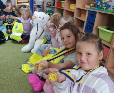 Dzieci z wielką ciekawością i aktywnością włączyły się w zajęcia, za co nagrodzone zostały pamiątkowymi medalami oraz odblaskowymi plecaczkami.